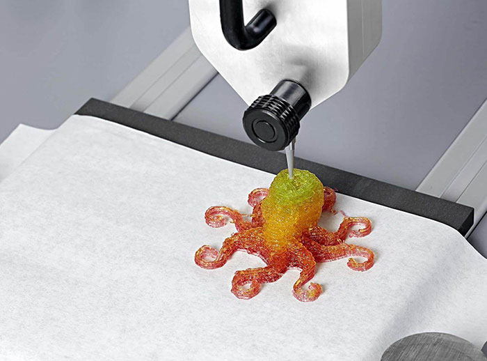 As of August 28th, you can now use a 3D printer to produce custom candy gummies in Berlin. The world’s first 3D candy printer, “Magic Candy Factory,” had been in development for over a year through German company Katjes Fassin’s UK subsidiary, and can print gummies in 3-10 minutes; competing machines take up to an hour. The machine uses very special and unique fruit gum liquid to produce 7 colors and flavors, and 10 shapes, weighing between 15g and 20g.