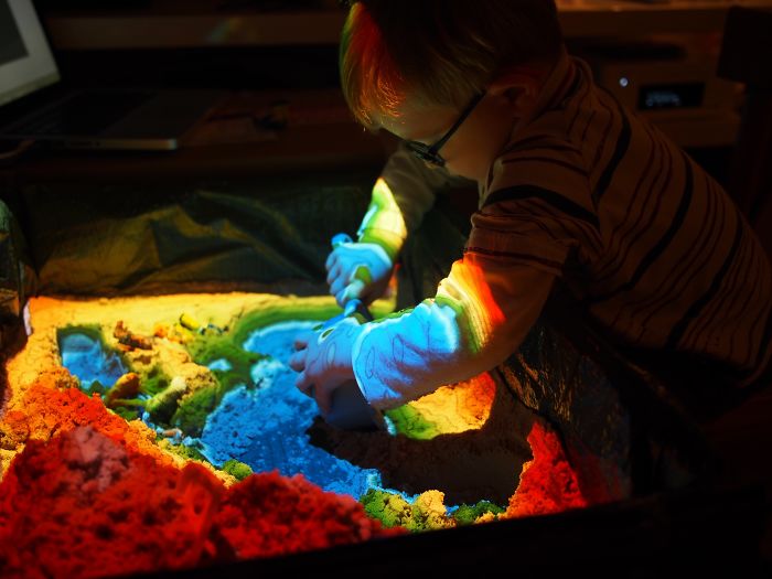 The principle of a magic sandbox is the following: a Kinect sensor checks the level of the sand, send it to a laptop then the laptop control the output of a projector hanging over the sand to project colors depending on the height.