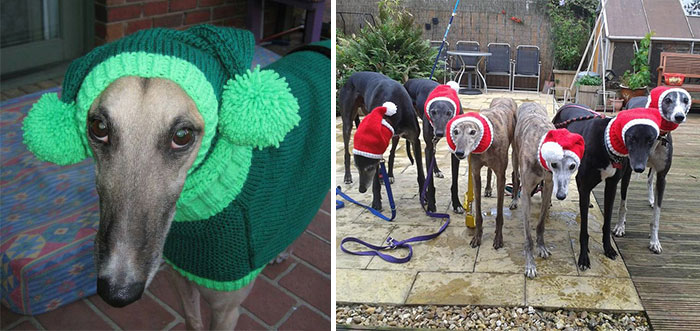 Jan Brown, a 52-year-old mom in Seaburn, UK, has been knitting beautiful and adorable sweaters for greyhounds and whippets since 2008. This holiday season, she has created some cute Christmas versions of her sweaters as well!