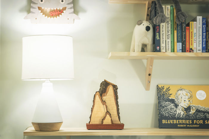 I liked the idea of the 3 mountains representing us as a family, the bark will fall off in bits over time and the wood may crack here and there, just like her parents!