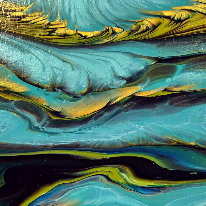 I will use the Split cup technique, but this time I poured it in kind of “dirty” way: from up high and fast to make some colors mix together. At the end of the pour I came up closer to create some delicate lines.