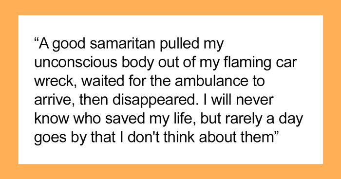 A good samaritan pulled my unconscious body out of my flaming car wreck, waited for the ambulance to arrive, then disappeared. I will never know who saved my life, but rarely a day goes by that I don’t think about them.