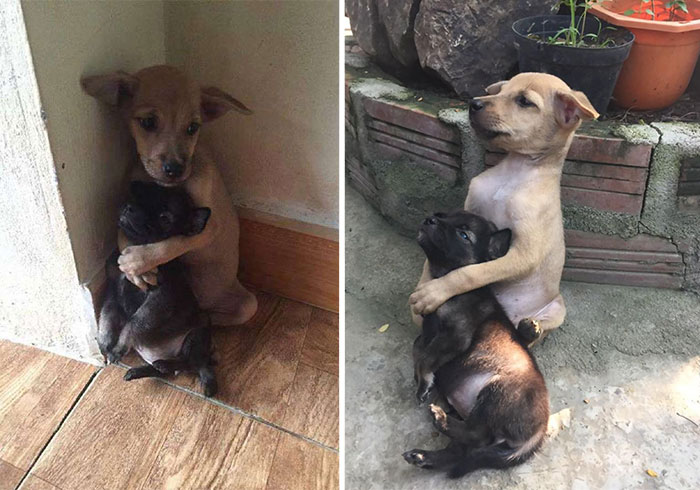 Two stray puppies have recently been adopted by Buddhist nuns in a pagoda in Ho Chi Minh City, Vietnam and the two haven’t stopped hugging each other ever since. Though the bigger pup still looks too tiny and helpless to even take care of himself, he keeps on holding his younger friend dearly in protection.