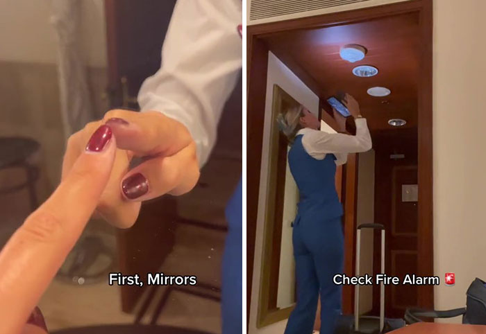 The woman starts the video by stating that the first thing she does once she checks into the hotel is check for hidden cameras. She begins with mirrors and uses probably the most popular way of checking for cameras – by putting her finger on the mirror. According to Serious Home Security, your finger will come into contact with the reflection of your finger in a standard mirror. However, if you have a two-way mirror, you will see a space between your finger and the reflection.