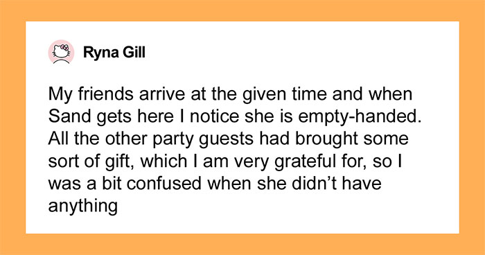 All the other party guests had brought some sort of gift, which I am very grateful for, so I was a bit confused when she didn’t have anything. Sand is not broke or poor and I know she can afford some sort of token of appreciation.