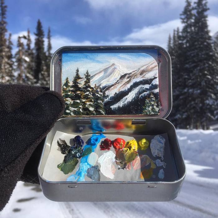 Colorado-based artist Heidi Annalise has an amazing talent to move wide open spaces into cute tiny boxes without losing their grace. She paints mesmerizing landscapes in mint tins where she attaches small pieces of palette paper to the top, and lays out a small palette of colours to work with on the bottom.