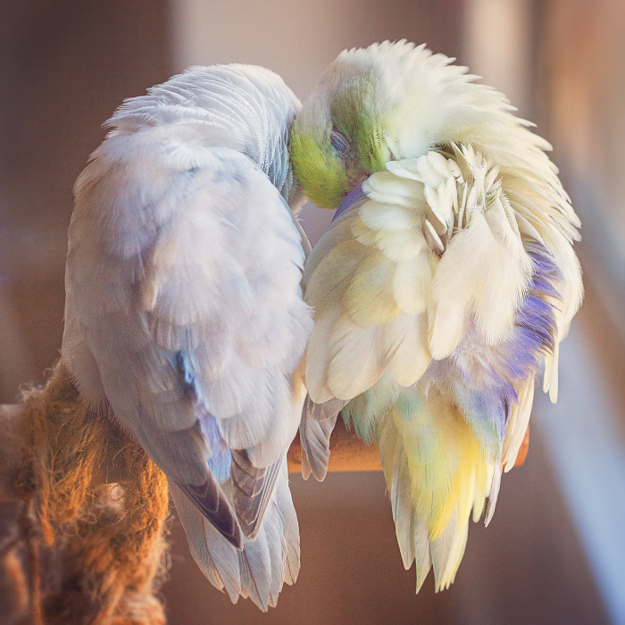 The love the pairs share is as big as their attitudes. They cuddle, preen, and care for each other daily. Observing and interacting with my pet birds has brought so much joy and laughter into my life. I’m captivated by their beauty, their intelligence, and their sweetness. They’ve quickly become one of my favorite subjects to photograph. I love to tell a story and convey emotion through my beautiful photos and editing. With their mischievous antics and love for cuddling, the birds provide me with plenty to capture! Viewing them through a macro lens reveals so many details that might have otherwise gone unseen… The tiny eyelashes, their little tongues, the perfection of their pastel-colored feathers.