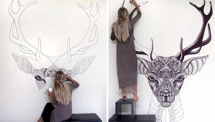 Artist Faye Halliday has been traveling around the world and leaving intricate murals along her way. She has always been inspired by beauty: “All over the world this concept moves, drives and even destroys us every day.” The giant designs are often inspired by her visited countries and usually revolve around animals. Faye currently lives in a wooden cabin in the Costa Rican jungle. “I’m simply providing a hand drawn pathway for other people to experience beauty and perception through my eyes and mind.”