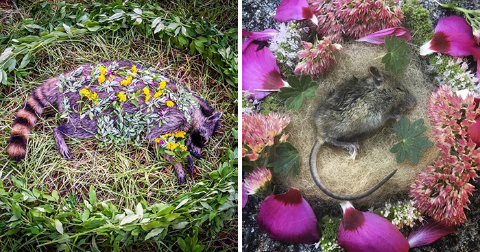 Since Amanda adores and respects our Mother Nature so much, she created this little tradition for herself to make a memorial for each dead animal she happens across. The woman adorns the body of the animal in flowers and photographs it as a way of honoring its life. She’s already made quite a few of these and they’re all absolutely beautiful yet utterly heartbreaking.