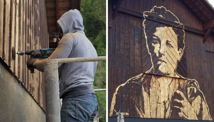 Arthur Rimbaud engraved in the wooden wall of a farmhouse.