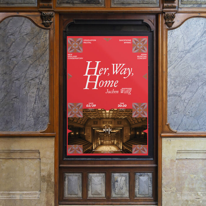 Her most recent work, Her Way Home, is more than a performance—it is a cultural movement. Created for the New England Conservatory, this multimedia project celebrates the resilience and artistry of Asian female musicians, using design as a narrative bridge between heritage and innovation. Combining evocative soundscapes with a rhythmically driven visual system, the project transforms personal stories of migration, memory, and belonging into a multi-sensory experience.