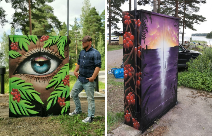 In small town of Finland, local water company Keski-Savon Vesi Oy asked the artist to spray paint electrical cabinets to prevent vandalism. Ugly boxes turned out to be the most beautiful outdoor art exhibition. Artist spray painted nature-inspired pieces to fit the gorgeous scenery filled with lakes and forests.