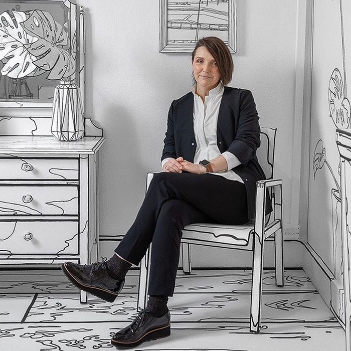 Anastasia shared that there was not a time in her life when she was not involved with art. “I have been making and studying art in some form my whole life. I began to work with installation art during my Visual Arts studies in France. The idea to create an entire room in drawing came to me at the end of my Master’s course when I made my first 3D drawn objects: a TV and a mailbox out of foam board. After graduating from university, I traveled a lot all around the world, so the only art I could make for a while was digital drawing. In 2017 I began to work on creating black and white furniture pieces and small objects. The installations you see today grew out of that, slowly but surely, over time.”