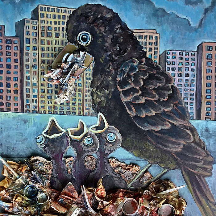 Assemblage painting made from single-use and non-recyclable plastic.