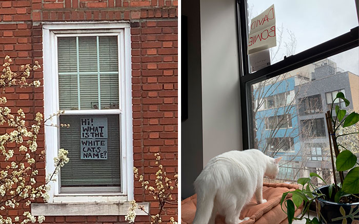 But the lockdown is making us all a tiny bit more creative. When Lizzie Bartelt put a poster asking “What’s the white cat’s name?” on her window, she