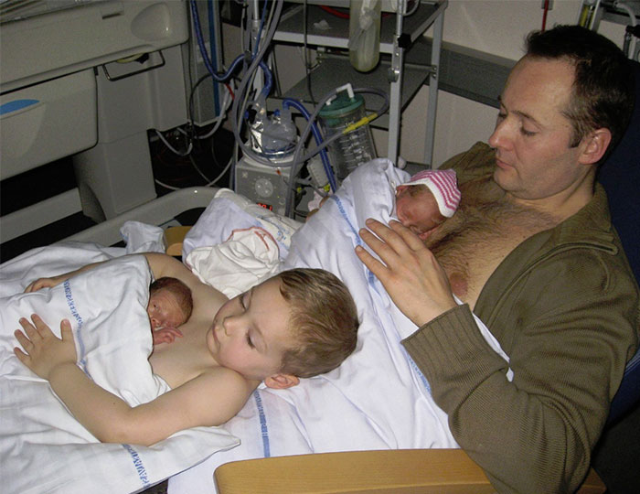 Check out the photo below to see what we mean. It was originally uploaded to Facebook last year by a Danish family advocacy organization called Forældre og Fødsel. Recently it was re-posted on Facebook by South Africa-based NINO and it’s since gone viral. The picture shows a father and his young son practicing skin-to-skin contact with newborn twins. the picture has since been shared over 18,000 times, and we can definitely see why.