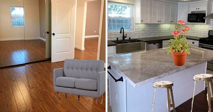When you’re renting out or selling your house, you want to put your best foot forward. That means that you polish the place up for the listing photos. You make the property look cozy. Inviting. Maybe you photoshop in an obviously fake couch, plant, and stools to make it seem more lived-in. Wait, what?!
