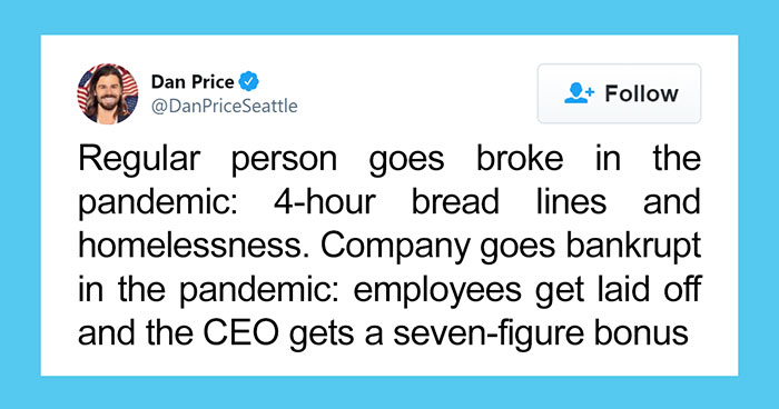 “Regular person goes broke in the pandemic: 4-hour bread lines and homelessness,” Dan Price wrote in a now-viral tweet. “Company goes bankrupt in the pandemic: employees get laid off and the CEO gets a seven-figure bonus.” He went on to share a list of the companies who did just that.