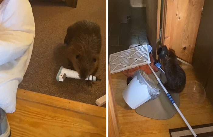Well, all’s fun and games until the beaver starts living out its Mother Nature-given instincts and starts building a dam. And if it wants to build a dam, it will, and it will use whatever building materials it finds lying around the house. Like pillows, tissue boxes, statuettes, metal frames, buckets, plungers, and whatever else it finds in its path!
