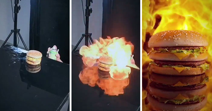 One way a filmmaker or photographer can prove they’re creative is making something wonderful with a low budget. We have already featured some photographers who tackled this subject, but now a collective of people are making the same point using video. Recently, one Chinese studio shared exclusive behind-the-scenes footage of their food ads, revealing just how far a few sharp minds can go. For example, they’ve made a TV-worthy shot of a burger using only a lighter and some gas. Scroll down to check out the footage that has already amassed over 2 million views on Facebook and tells us what you think about it in the comments.