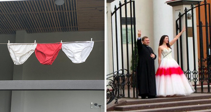 A few days ago, people in Belarus started noticing that police officers, firefighters and other people are removing white-red-white flags from buildings and other public places. Without any explanation. It seems as if the authorities decided to ban the flag. And since the flag is, apparently, not allowed, people have been recreating the historical flag using random objects. Bored Panda invites you to take a look at some of the best recreations of the Belarus white-red-white flag.