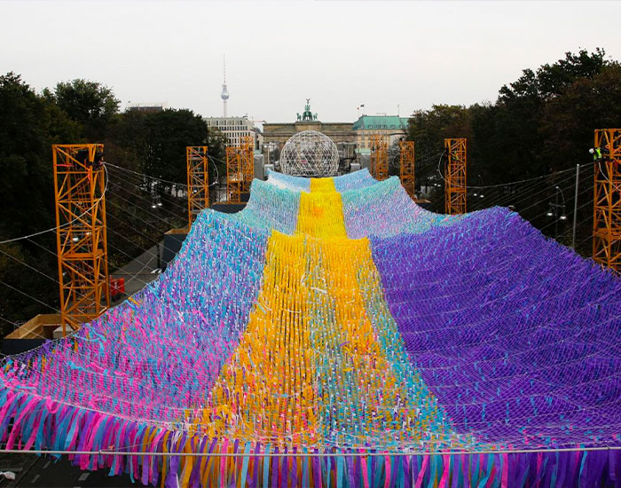On November 9th, Berlin celebrated the 30th anniversary of the Peaceful Revolution and the Fall of the Berlin Wall. The highlight of the celebration was Patrick Shearn’s and his Poetic Kinetics team’s colorful motion art installation comprised of 120,000 colorful fabric ribbons.