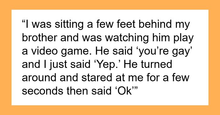 I was sitting a few feet behind my brother and was watching him play a video game. He said “you’re gay” and I just said “Yep.” He turned around and stared at me for a few seconds then said “Ok”, then turned around and continued playing his game.