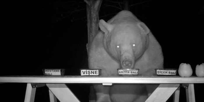 The beekeeper set up a table with 4 kinds of honey for the bears to feast on. He wasn’t disappointed with the result. As it turns out, bears have quite an expensive taste.