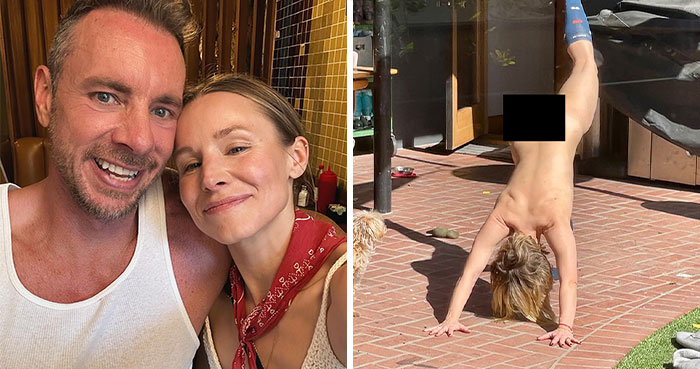 To mark the milestone, he shared a risqué photo of Kristen in their backyard, striking a downward dog pose while soaking up the sun.