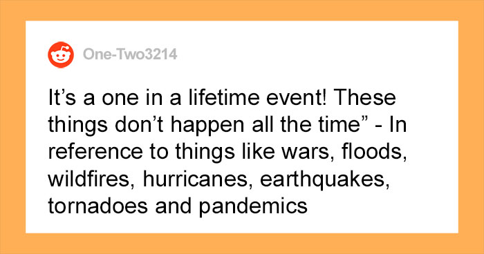 “It’s a one in a lifetime event! These things don’t happen all the time” – In reference to things like wars, devastating floods, wildfires, hurricanes, earthquakes, tornadoes, mass shootings/gun violence, terrorist attacks, and now… pandemics, apparently.