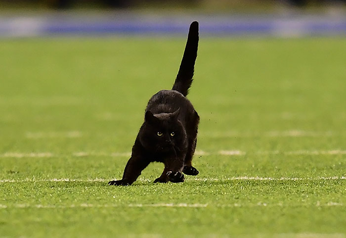 A stray black cat accidentally crashed an NFL match, much to the crowd’s amusement