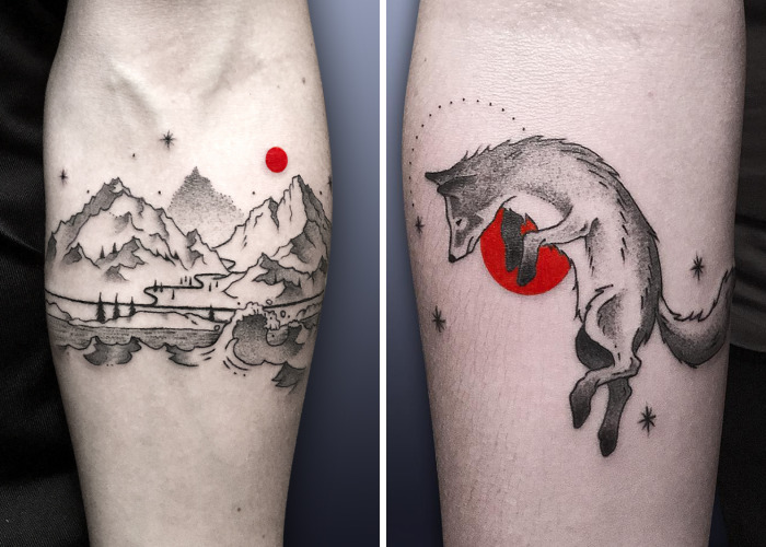 Suddenly I was out of that soul-crushing work routine and I was so happy to do what I like. I wanted to reflect this on my tattoo ideas and I honored this change with the red dot. I like black tattoos and I didn’t want to involve colors that’s why a bright red dot was the best choice to catch a contrast with unique tattoos done in black. It also created a contradiction to burdensome times in my past and It was to symbolize hope and courage. My customers like the idea of the red dot and they started to give meanings to their own dots. It was health for one, happiness for another, a lost relative, a planet, or just a sinking sun. Two years have been passed since my first body art commission. During this time I tattooed hundreds of people from all around the world. I listened to their stories. I have become part of their lives and I helped them to carry their stories on their bodies with cool tattoos.