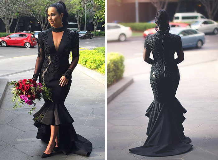 Australian blogger and loving mother Sophie Cachia decided to do something different for her wedding. Instead of getting married wearing a traditional, white wedding gown, she opted for a stunning black dress, while her husband, Jaryd, wore a maroon dinner jacket with a paisley shirt, black bow tie, and leather pants. The Cachias say that they did it for themselves, but Sophie is even more candid in her explanation: