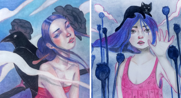 “Blue-haired Girls” includes a series of paintings created with acrylic, watercolor, ink and colored pencil that depicts female travelers with companions.
