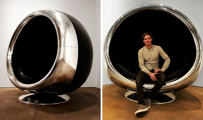 The chair is made from a genuine Boeing 737 jet engine. It features a polished aluminum swiveling base and a black-leather upholstered interior. There’s no price on the website so chances are that it doesn’t come cheap, but then again, what do you expect? It’s a jet engine! That you can sit in!