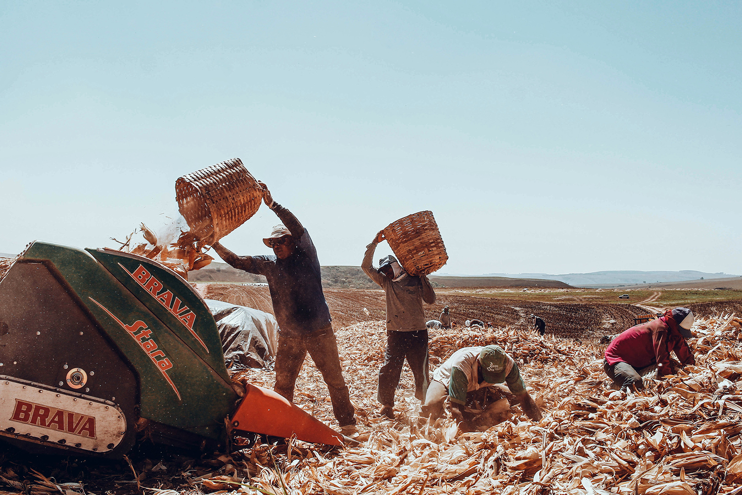 “It is interesting that there is a small but essential production of straw cigarettes in the interior of Brazil. The beginning of the output of the ‘haystack,’ as these cigarettes are known, is carried out by men and women. They face the dry air of the heights of the drought, the harrowing heat, and swirls of dust that appear all the time. These workers deal directly with the corn straw, which is sharp, so the bandages on their hands are more protection than dressings. First, the harvester breaks the ears, and then a group equipped with improvised butcher knives cuts them, a job that requires the strength of delicacy, thus separating the straw into large bags that go on to manufacture the haystack. Afterward, a group collects the disheveled ears, filling them with large baskets that are thrown back in the harvester so that the grain is threshed.”