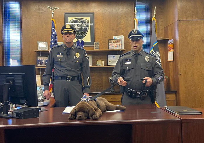 Brody the Bristol PD K9 therapy dog slept through his own swearing-in ceremony, even in his partner’s arms