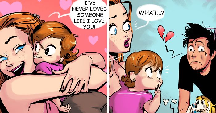 Comic book artist and creator, Erez Zadok, shared with Bored Panda that since then, things have changed a little – after having a daughter May, Lina, his beloved wife, and his lives are even more colorful. In this new series, Erez is sharing all the happy (and exhausting!) moments of parenthood. Even though Joya is not the focal point now, she’s still escorting him everywhere he goes and always has something to say. Or bark.