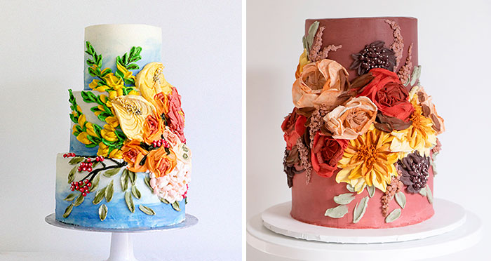 I’m a cake artist, international cake decorating instructor and owner of 10 Bloom Cakes. I achieve my stunning cake creations with palette knives buttercream and whipped cream only (no fondant!). My inspired color combinations and unique floral cakescapes will leave you breathless. On average it takes me about an hour per tier to decorate these delicious works of art.