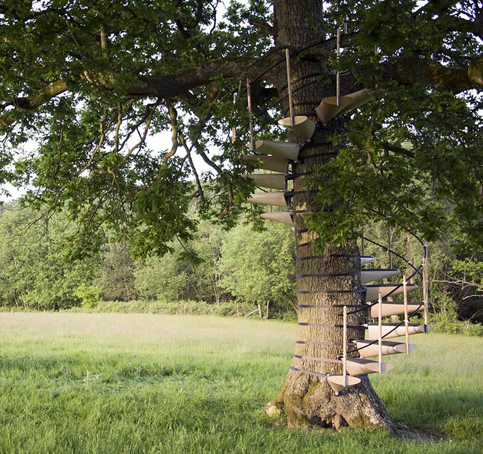 Their innovative staircase is made of birch steps that hold on to the tree trunk with straps and grip its side with thick neoprene pads. Attaching a series of these steps, along with an accompanying handrail, creates a spiral staircase.