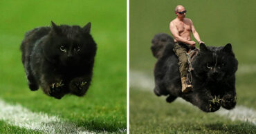 The kitten jumped from its display in the most adorable clumsy manner as one could expect from such a fluffball. As the kitten was uneasily balancing over the pup’s booth, the pooch couldn’t hold its excitement, too, and stood on its two paws to help the kitty get in. One brave jump and the two were together!