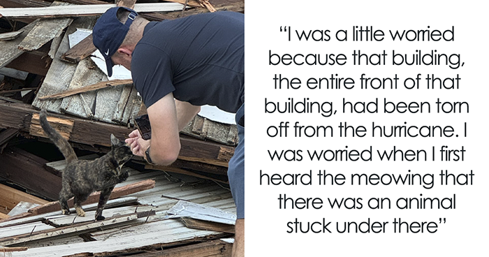 A reporter had just arrived in the Tampa Bay area to document the damage that the hurricane left in its wake. Suddenly, he heard meowing among the rubble, and when he came closer to investigate, a perfectly healthy cat emerged, starting to purr and rub against his legs as if the front of the building she was in hadn’t just been torn off. Scroll down to learn all about it!