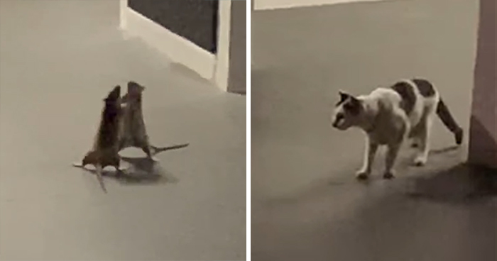 “On my way home to this amusing sight!” Cheez Goh wrote on her Facebook upon sharing a video of this now-viral fight between two rats. “We’re so used to seeing cats fighting. But have you ever seen rats fighting? A cat that never interrupts is a smart cat. Guess which rat did the cat chase after? The one that runs away from my direction or the one that comes towards my direction? Guess correctly, I’ll buy you coffee,” she shares. No need to bother the woman with requests for coffee now, because Bored Panda will let you in on the secret if you scroll down below.