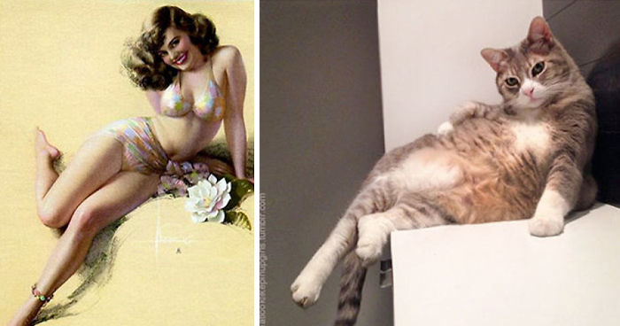 The premise is simple – find a picture of a beautiful pinup, and then find a picture of a funny cat that matches it (or the other way around). Cute kitties and beautiful pinups go well together just like cute kitties and… well, just about anything else, really.