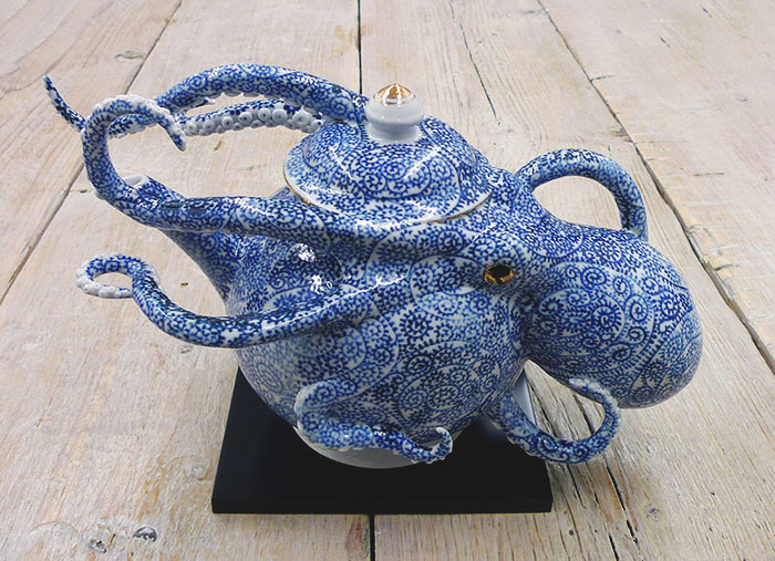 This time, Masumoto works on this idea incorporating incredibly intricate blue-and-white paint patterns. This decorative style has its roots 14th-century traditional Chinese wares but unlike the strictly utilitarian old pieces, Masumoto’s vases, teapots, and urns have octopi popping out of them. Her contemporary take on ceramics could also be understood as surreal sculptures with coiling tentacles, bloated heads, and ever-watching mystic eyes.