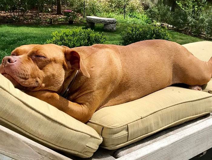 Lola the doggie had spent 8 years chained up in a dark garage just lying on cold concrete floor, prior to being rescued by AMA Animal Rescue. For the last seven weeks she has been living with her new human mom, Charlène von Saher, in Manhattan. During that time, the abused doggie has already perfected the art or relaxation, taking the concept of ‘comfort’ to the next level.