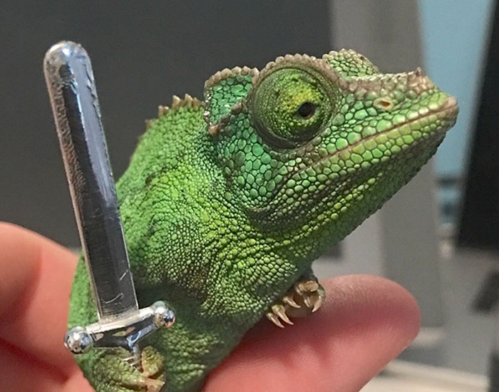 As it turns out, chameleons can entertain the crowd even when they’re not changing colors. Michigan-based artist Emma Ward has shared pictures of her pet reptile Olive grabbing tiny weapon props and the internet just couldn’t handle it.