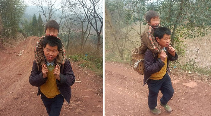 Xukang’s day begins at 5 A.M., when he wakes up to make the day’s lunch for his son, Qiang. He then carries his son 4.5 mi (7.2 km) to the nearest school that would accommodate him and walks back home to work, making the same trip again to pick him up and take him home.