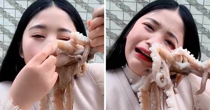 The 50-second video was shared on popular short-video platform Kuaishou. It shows Seaside Girl Little Seven battling an octopus while trying to eat the eight-armed creature alive. The octopus apparently tried to defend itself by sticking to her face with its suckers.