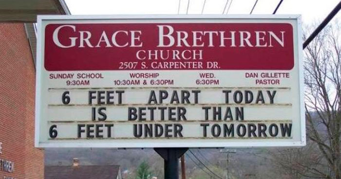 Church signs in the US can be a lot of fun, cheering us up but also making us think. Though the vast majority of churches are now either closed or seeing far fewer people walk through their doors because of the coronavirus, their sense of humor and ability to give well-timed advice haven’t gone away.
